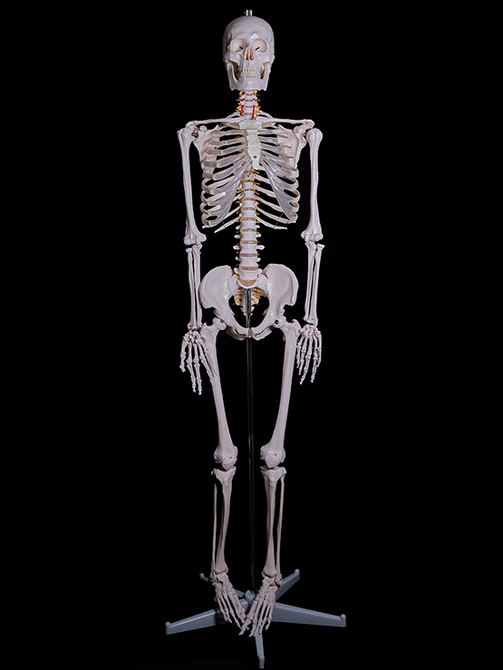 Кости выполнены в соответствии со строением скелета человека, и изготовлены из жесткого пластика белого (или светло-желтого) цвета. Крышка черепа съемная. Нижняя челюсть черепа подвижная, на пружинках. Верхние и нижние конечности легко съемные. Для сохранности при транспортировке конечности сняты. Скелету придана естественная поза стоящего человека. Позвоночник Гнущийся!. Ребра, тазовые кости и череп жестко соединены с позвоночником. Конечности присоединяются на шарнирах. Скелет устанавливается на хромированную стойку на металлической подставке